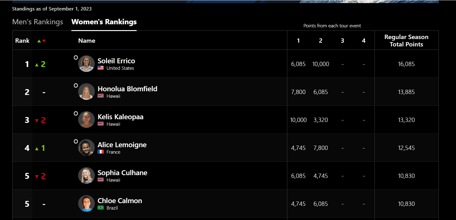 On the women’s tour, former world champion Soleil Errico leads the rankings, followed closely by two-time world champ Honolua Blomfeld in second and Waikiki’s Kelis Kaleopaa only a few hundred points behind in third.