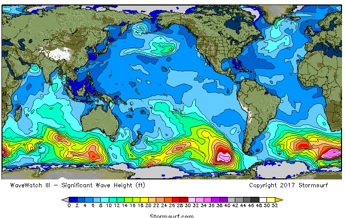 To make things just a little more complicated, one has to take into account both the decay in the size of a wave and the increase in period over long distance. For example, let’s say that a storm creates 50-foot waves. When it is created, the swell will essentially be 50 feet at 1 second. The further that swell travels, the smaller the wave height will become, but the greater the period will become. Depending on the bathymetry of the coastline that eventually causes the waves to break, the decrease in wave height will be somewhat offset if not altogether overpowered by the increase in period. So, for instance, if the swell has decayed to 10 feet at 15 seconds, it may actually manifest as smaller waves than when it has decayed to 8 feet at 18 seconds. But there will eventually come a tipping point where the height of the wave has diminished so greatly that even a very long period won’t make much of a difference. For example, a 0.5 foot at 25 second period swell might not even be visibly apparent at your local beach if there also happens to be a 3 foot at 10 second swell running at the same time.