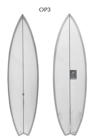 Description: The OP3 (Ocean Pro 3) is an update to Chris Christenson’s OP1, adding a spicy swallowtail to make the board a bit looser and more versatile. The release of the swallowtail provides a fishier feel, making this board a bit more fun when the waves get weaker and skatier. If the conditions are a bit soft but you still want to shred hard, the OP3 is a great option. You have the ability to choose from different fin systems and construction processes, making the OP3 extremely customizable.