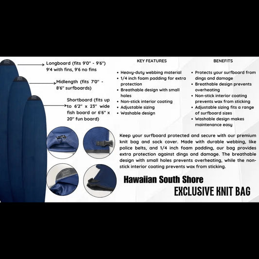 HawaiianSouthShore Knit Surfboard Sock Stretch Mesh Non-Stick FUNBOARD - Fits boards from 7'0" to 8'6"