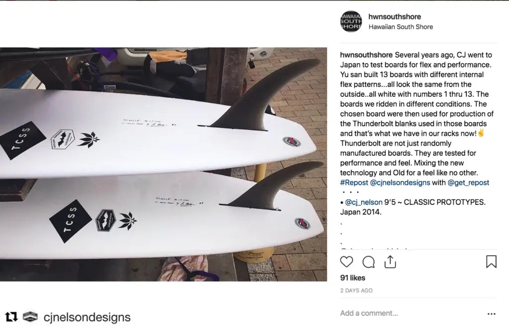 This was such a cool Instagram post by CJ Nelson. It shows the demo boards he used to test for Thunderbolt Technologies. When I heard about how Yu San the man that pretty much came up with this technology, I thought it was really awesome. Yu San has known CJ since they were kids and surfed together. When Yu approached him, CJ was totally against the ideas of this type of construction, but after many months of convincing him to just demo it. If CJ didn’t like it, no problem, because Yu San was willing to go back to the drawing board. Yu San being a pro surfer himself, knew he was on to something. Anyways check out the post, I pasted here.