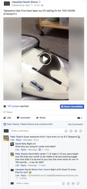 They set me up with everything I needed and sent me on my way to catch some great waves. Well as I went to paddle out I noticed that I couldn’t get my rail fins in their boxes. So, I paddle out anyway and had an epic session. I called the guys at HSS and told them about my problem. They told me to bring my board in and all would be taken care of. When I got back from the mainland (3 weeks later) I brought my board in. They swapped it out for a brand new one without me ever asking. These guys were that great. They waxed it up and placed all the fins in and gave me a hardy handshake and free tee shirt.