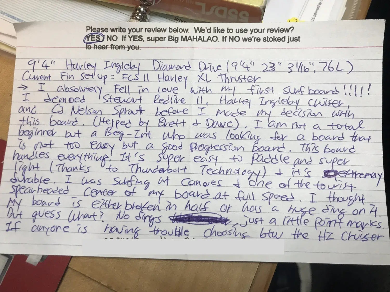 Mahalo to David and the Hawaiian South Shore crew! You guys helped me choose an awesome CJ Nelson longboard and provided incredible service to me! “9’4 Harley Ingleby Diamond Drive (9’4 23” 3 1/16” 76 L). Current fin set up = FCS II Harley XL Thruster