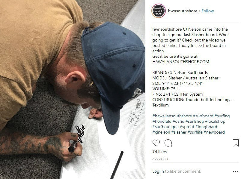 CJ Nelson came into the shop to sign our last Slasher board. Who's going to get it? Check out the video we posted earlier today to see the board in action. Get it before it's gone at: HAWAIIANSOUTHSHORE.COM BRAND: CJ Nelson Surfboards MODEL: Slasher / Australian Slasher SIZE: 9'4" x 23 1/4" x 3 1/4" VOLUME: 75 L FINS: 2+1 FCS II Fin System CONSTRUCTION: Thunderbolt Technology - Textilium