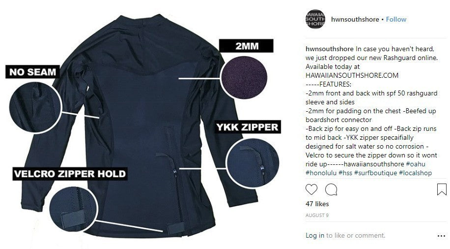 In case you haven't heard, we just dropped our new Rashguard online. Available today at HAWAIIANSOUTHSHORE.COM FEATURES: -2mm front and back with spf 50 rashguard sleeve and sides -2mm for padding on the chest -Beefed up boardshort connector -Back zip for easy on and off -Back zip runs to mid back -YKK zipper specaifially designed for salt water so no corrosion -Velcro to secure the zipper down so it wont ride up------hawaiiansouthshore