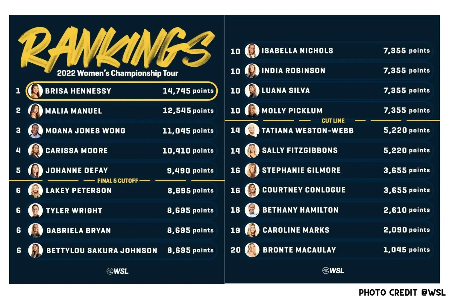 On the men’s tour, there are only four Hawaiians above the cutoff line, but our local crew are dominating the top five. Rookies Barron Mamiya and Seth Moniz sit in first and second respectively, and have a strong lead on the rest of the pack after their dominant performances in their home waves. Their early position is especially important since only the top five rated surfers at the end of the year will compete for the world championship at a one-day event at Trestles. Kanoa Igarashi and Kelly Slater currently sit in second and fifth, while Brazilian Caio Ibelli has taken full advantage of his injury wildcard berth and established himself in fourth. John John Florence is a ways down the rankings at equal 10th, as is fellow Oahu resident Ezekiel Lau and Western Australian tube fiend Jack Robinson.