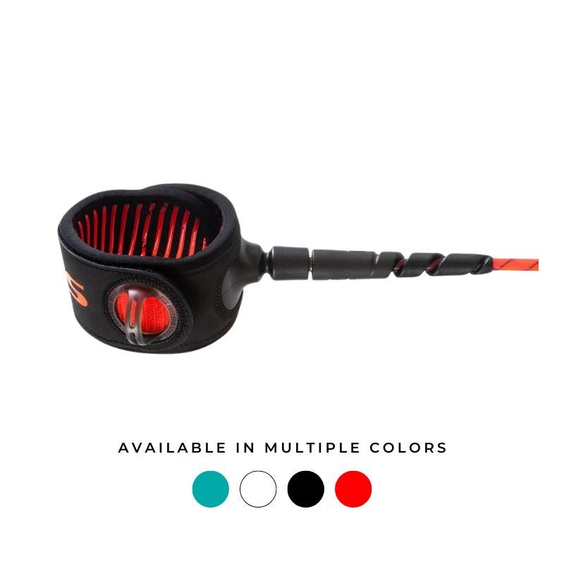 The FCS Freedom Helix is the latest high-tech offering from one of surfing’s most innovative brands. Combining lightweight construction, increased strength, and environmental sustainability, this cutting-edge leash is an example of the benefits of introducing modern technology into surf hardware. The Freedom Helix uses 50 percent corn-based bio-resin, which increases strength per diameter while decreasing environmental impact. This increased strength allows for a thinner, hollow skeletal horn structure in the cord that reduces both weight and drag. The cord also features a slightly textured bump that improves the leash’s hydrodynamics, further reducing drag. That, plus a streamlined cuff and titanium swivels, results in a super light, low-drag leash that is comfortable and fast. Available in the ultralight Comp model, sturdy All Round model, and Longboard model, the FCS Freedom Helix represents the current apex of quality leash construction.