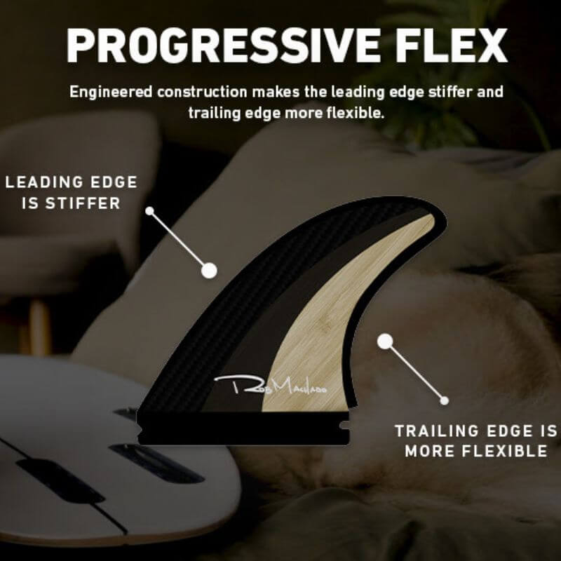 Rob took special care with this fin's construction, wanting to create a technically progressive flex throughout the template. Because of the various carbon layups in combination with the bamboo core, the leading edge is stiffer while the trailing edge has more flex. This construction's progressive flex provides spring and liveliness out of every turn, while maintaining the immediate response and drive required for high-performance surfing.