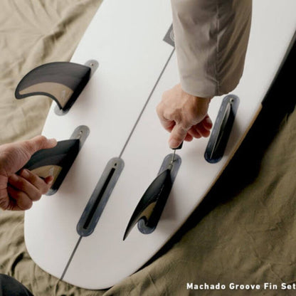 The Machado Groove Fin Set is a throwback to Rob's performance days, and is a five fin template for high-performance surfing. This fin set is lively and responsive in punchy, hollow waves from around waist-high to overhead. The construction's progression flex provides spring and liveliness out of every turn, while maintaining the immediate response and drive required for high-performance surfing.