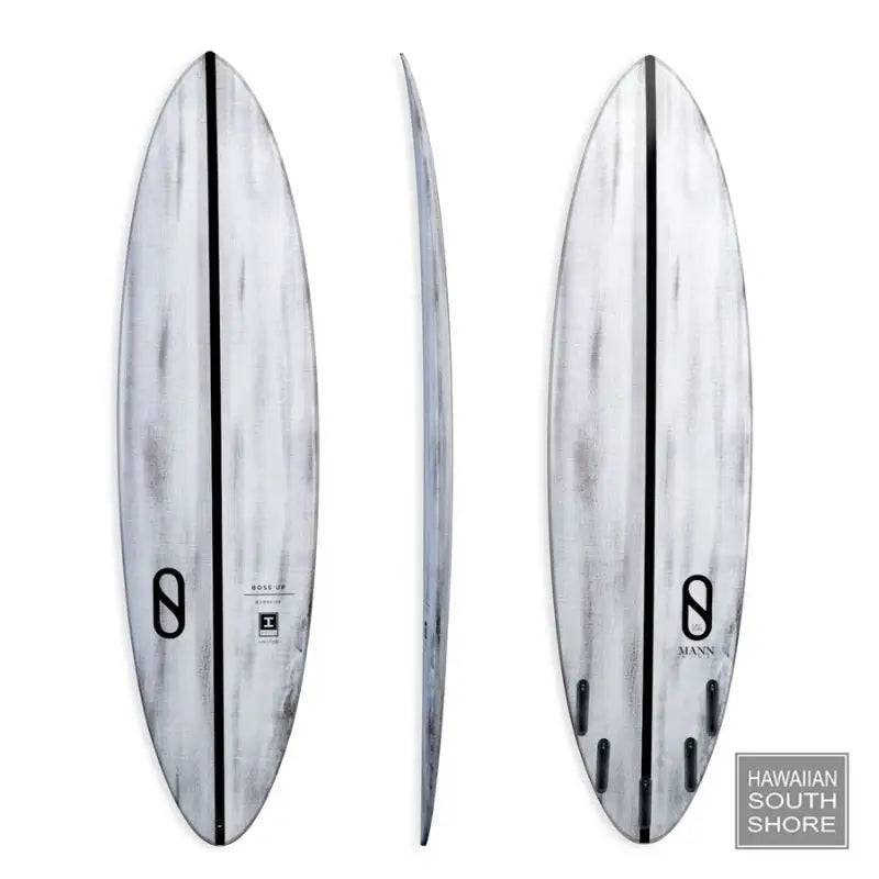 Dan Mann, one of the board's designers, recommends a quad fin configuration for the Boss Up. He suggests using a larger front set of fins with adjustable rear quad fins to fine-tune the board's sensitivity and looseness. The rear fins should have a slightly more upright, 80/20 foil, which differs from the typical 60/40 ratio