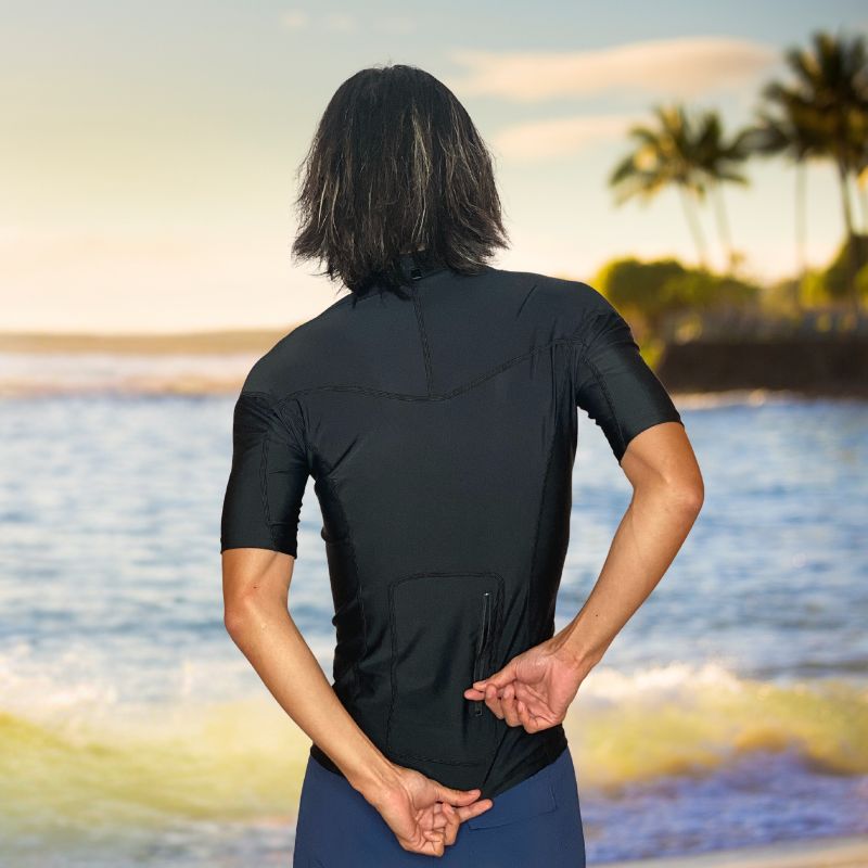 Our Hawaiian South Shore surf top is a combination wetsuit top/rash guard, for those cool mornings when you need a little extra insulation, and want to keep your session going well into the morning hours when the sun starts to heat up. A 2mm neoprene chest and back provides warmth and also padding for your chest while paddling. Meanwhile, the SPF 50 rash guard material on the arms and sides offers sun and rash protection without sacrificing flexibility as you paddle.Ā