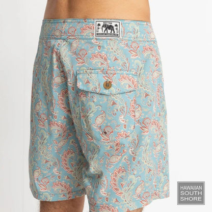 Elevate your beach attire with the Paisley Trunk in Slate, crafted from an 80% Polyester and 20% Cotton blend. These 17.5-inch trunks feature a custom sublimated pattern designed in-house and offer a contoured waist for a secure fit.