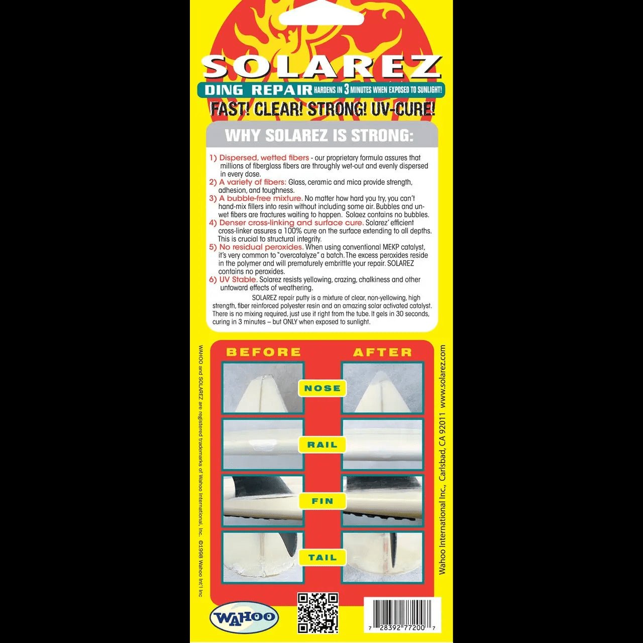 SOLAREZ repair putty is a mixture of clear, non-yellowing, high strength, fiber reinforced polyester resin and an amazing solar activated catalyst.